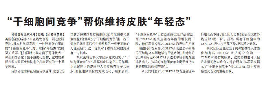 科技日報北京4月3日電(記者張夢然)英國《自然》雜志3日在線發(fā)表的一項(xiàng)老化研究稱,日本科學(xué)家發(fā)現(xiàn)由一種膠原蛋白驅(qū)動的“干細(xì)胞…